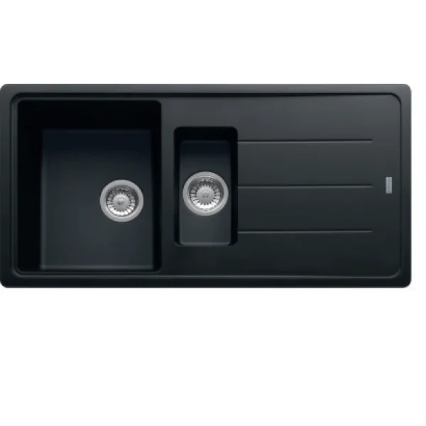 Evier en Fragranite encastrable Couleur Onyx Evier réversible 2 bacs + égouttoir Evacuation 3 ½” (Ø 90) Dimension du bac : 2x340x420x200 mm Dimension : 1160x500 mm Mesures d'encastrement : 1140x480 mm Largeur du caisson : 800 mm Livré avec siphon et bonde.