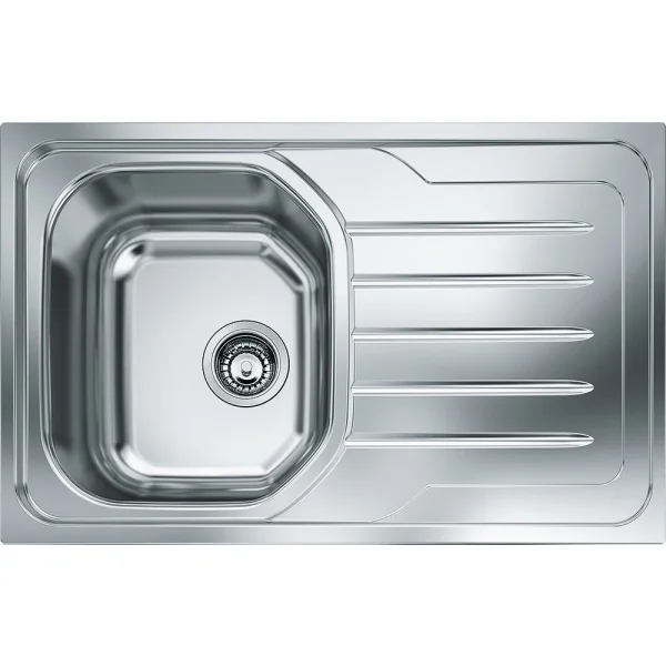 Evier en Inox AISI 304 encastrable Finition : Satinée Un bac + égouttoir à droite ou à gauche Evacuation 3”1/2 (Ø 90) Epaisseur de l’inox : 0,6 mm Dimension des bacs : 340x400x175 mm Dimension : 860x500 mm Mesures d’encastrement : 840x480 mm Largeur du caisson : 500mm Livré avec siphon et bonde