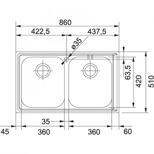 Evier en inox AISI 304 encastrable Finition: Satinée 2 bacs sans égouttoir Evacuation:3 1/2”” Dimension du bac :2x 360x420x180 mm Dimension:860x510 Largeur du caisson : 800 mm Livré avec siphon et bonde