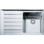 Evier en Inox AISI 304 encastrable Finition : Dekor 1 bac et demi + égouttoir à droite ou à gauche Evacuation 3”1/2 (Ø 90) Epaisseur de l’inox : 0,6 mm Dimension du bac : 340x400x195 / 165x306x150 mm Dimension : 1000x500 mm Mesures d’encastrement : 980x480 mm Largeur du caisson : 600 mm Livré avec siphon et bonde Système TIS inclus
