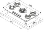Table de cuisson de 60 cm en inox AISI 304 Finition : Satiné Nombre de feux : 4 Puissance : 1 Feu auxiliaire 1000W 2 Feux semi-rapide 1750W 1 Feu rapide Triple couronne 3800W Allumage électrique intégré Valve de sécurité Grilles en fonte Dimensions hors tout (LxP) : 590x510 mm Dimensions d’encastrement (LxP) : 550x480 mm